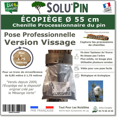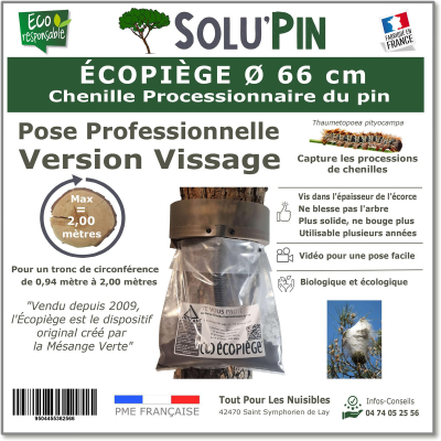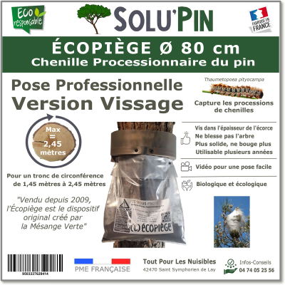 L'écopiège version vissage SOLUPIN est le Piège pour capturer les processions des chenilles processionnaires du Pin. S'adapte sur un tronc d'une circonférence comprise entre 3,90 mètres à 5,60 mètres Composition du piège : 1 collerette, 1 mousse marron découpable, 1 tube noir, 1 Sac collecteur transparent, 1 sachet de mastic, 2 vis Torx 6x30, 15 vis Torx 6x50.