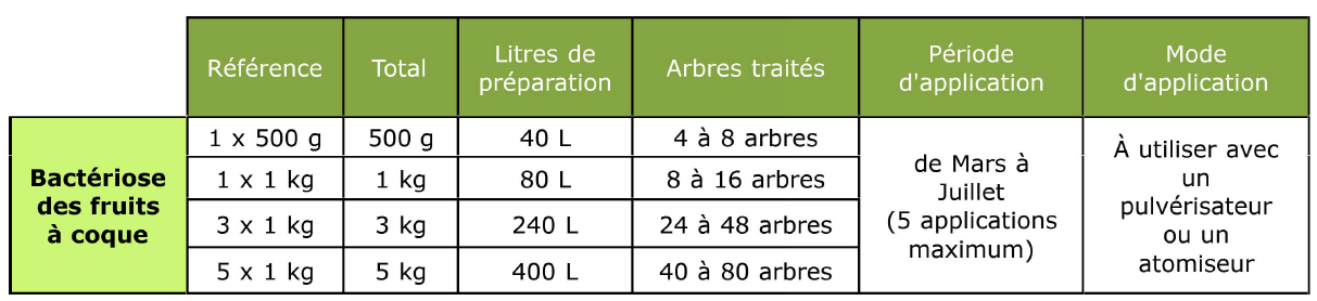- Bactériose des arbres à coque : 25 g/L d’eau
