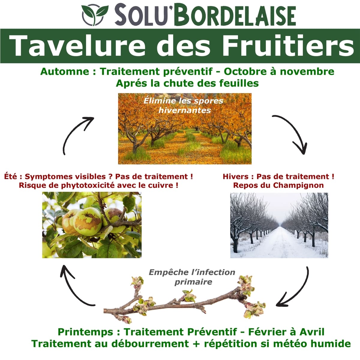 - Traitement préventif principal : Fin d’hiver (février – Avril), au moment du débourrement.