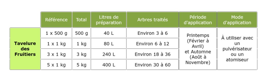 - Tavelure des fruitiers : 12,5 g/L d’eau