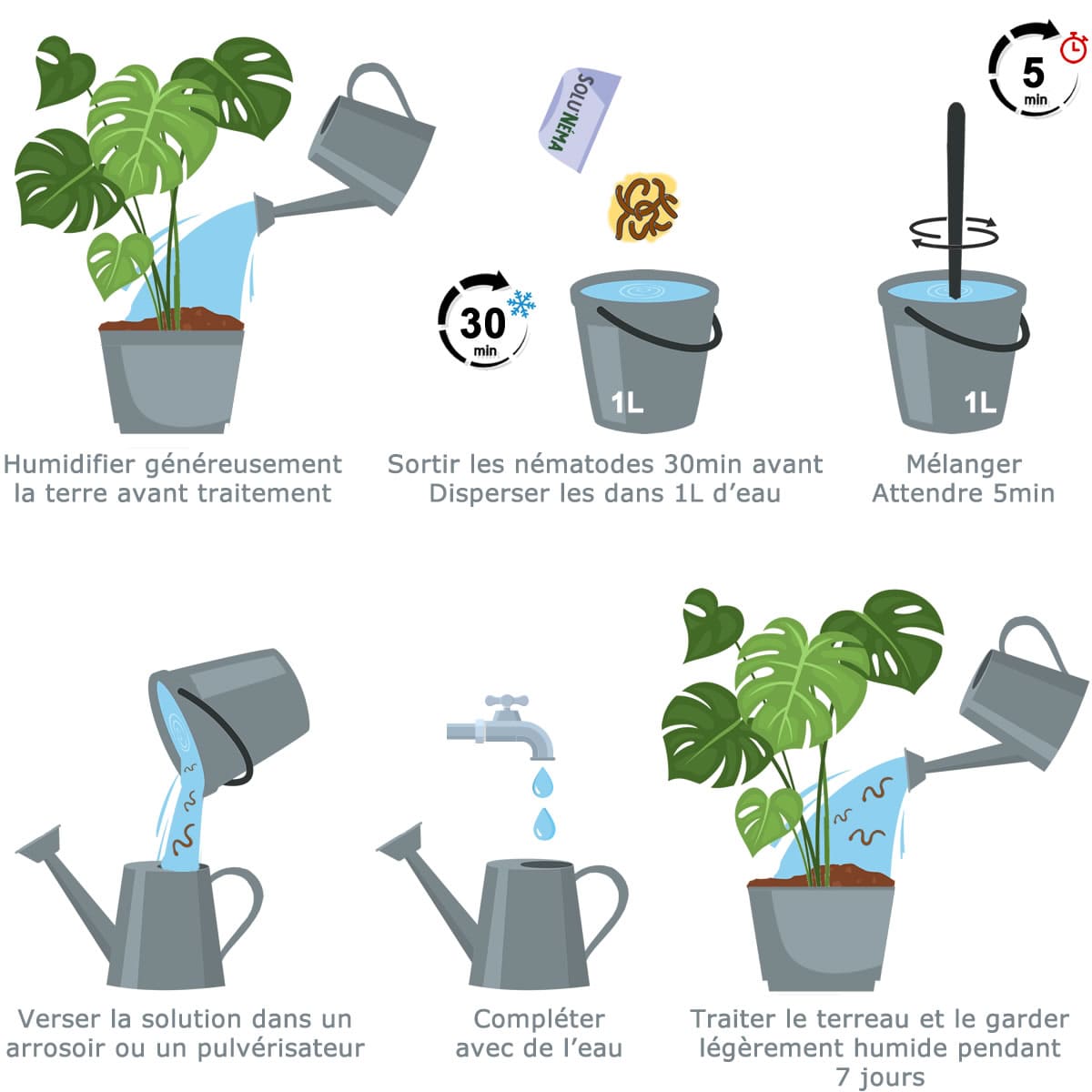 Les nématodes ont besoin d'un environnement humide pour survivre. Pour maintenir leur efficacité, continuez d'arroser régulièrement le terreau légèrement. Les nématodes ont besoin d'humidité pour se déplacer dans le sol et trouver les larves de la mouche.