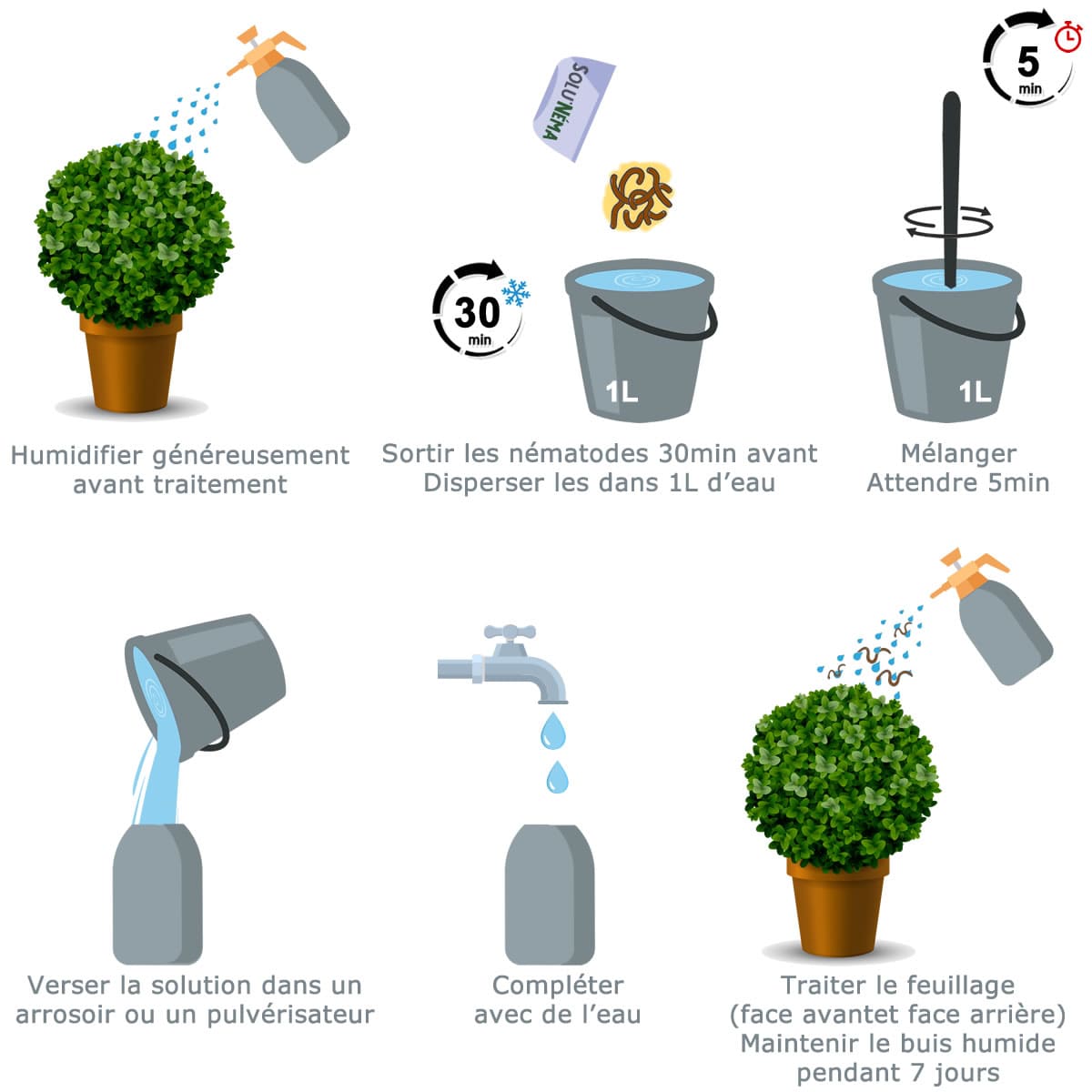 Les nématodes ont besoin d'un environnement humide pour se déplacer jusqu'à leur proie. Pour maintenir leur efficacité, continuez d'arroser régulièrement vos buis.