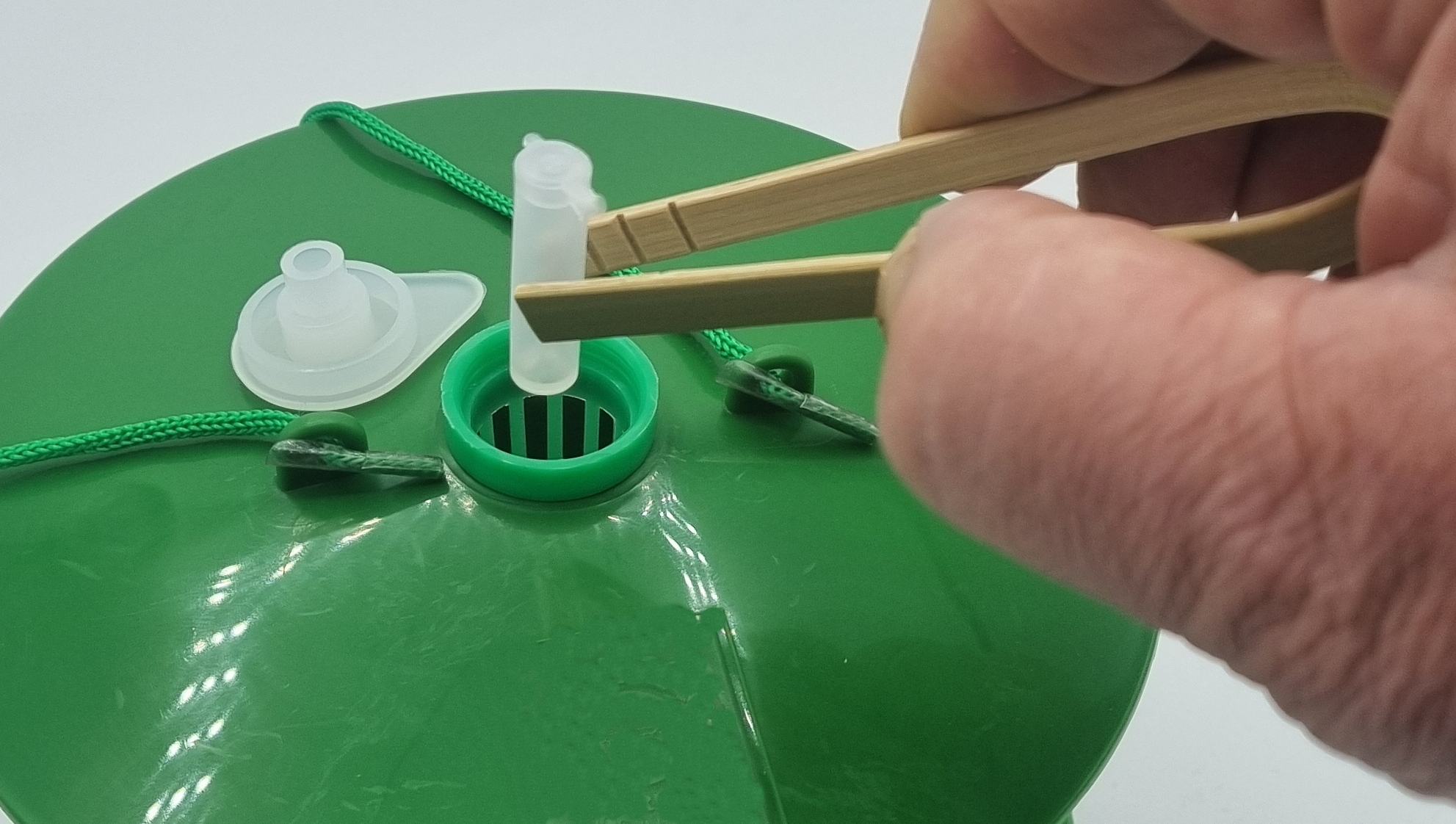 ·Placer le panier à phéromone sur le couvercle vert et mettre la phéromone dans le fond du panier à phéromone vert (SANS TOUCHER LA PHEROMONE) puis refermer le panier à phéromone avec son opercule de fermeture.