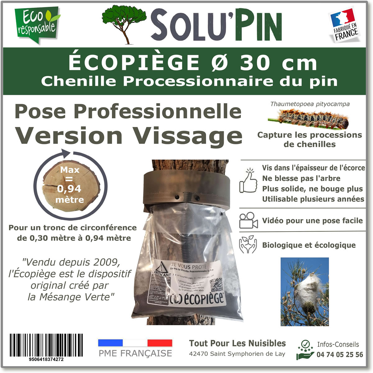 L'écopiège version vissage SOLUPIN est le Piège pour capturer les processions des chenilles processionnaires du Pin. S'adapte sur un tronc d'une circonférence comprise entre 3,90 mètres à 5,60 mètres Composition du piège : 1 collerette, 1 mousse marron découpable, 1 tube noir, 1 Sac collecteur transparent, 1 sachet de mastic, 2 vis Torx 6x30, 15 vis Torx 6x50.